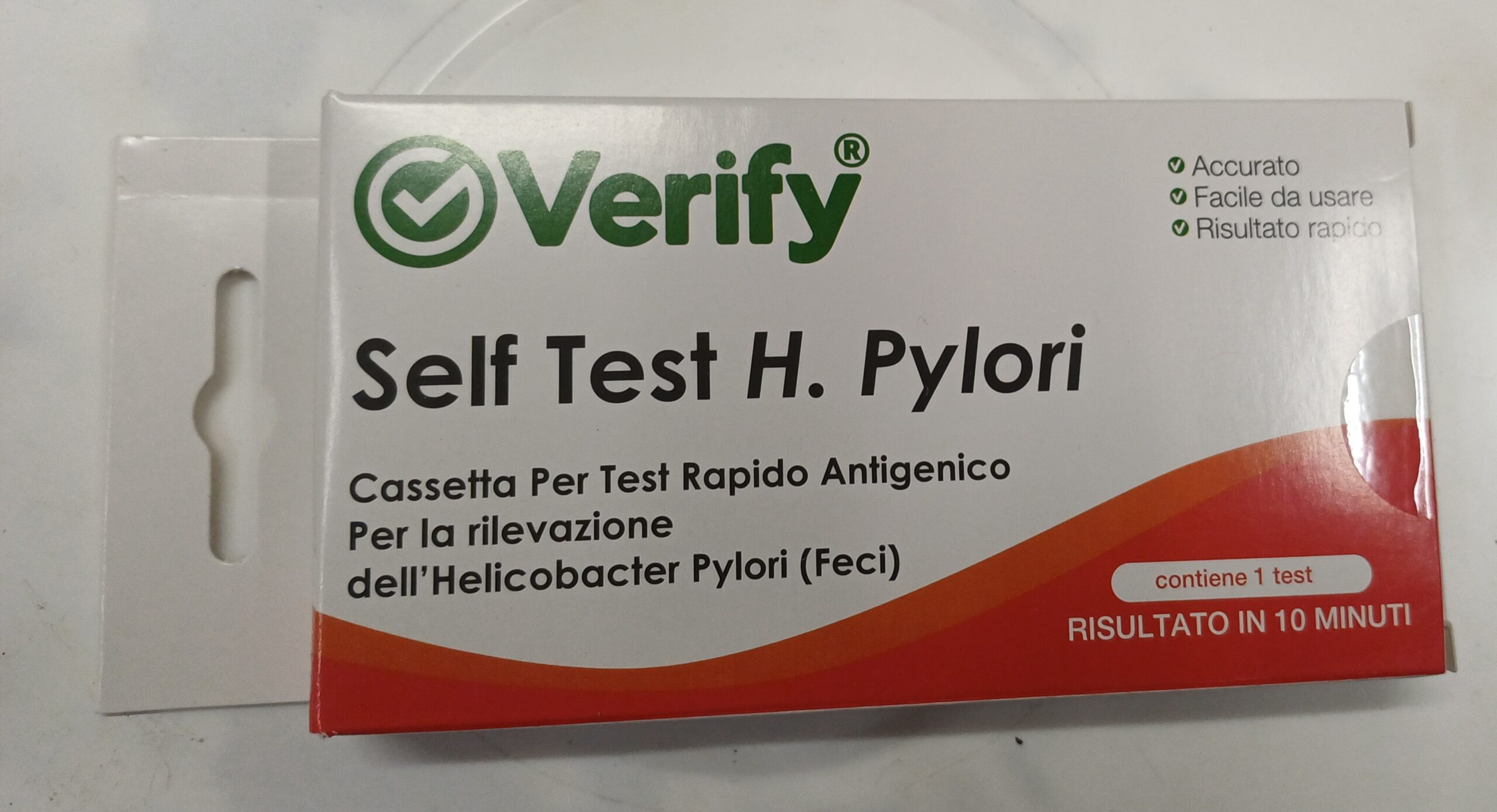 IL TEST RAPIDO ANTIGENICO H.PYLORI VERIFY E’UN TEST IMMUNOLOGICO PER LA RILEVAZIONE QUALITATIVA DEGLI ANTIENI H.PILORY IN CAMPIONI DI FECI UMANE CON RISPOSTA IN 10 MINUTI .IL TEST RILEVA ANTICORPI SPECIFICI PER GLI ANTIGENI H PYLORI PER RILEVARE SELETTIVAMENTE GLI ANTIGENI H .PYLORI.LA CONFEZIONE CONTIENE 1 TEST.RISULTATO IN 10 MINUTI